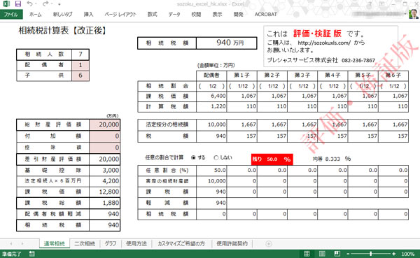 地元国税局・税務署出身の税理士さんが監修しているので安心して購入しました。導入後はシミュレーションにかける時間が劇的に削減できました。おかげで、お客様とお話する機会も増え、信頼感UPにつながっています。もちろん、遺言書の受任件数も増え経営も安定しています。被相続人の直系卑属である者が養子となっている場合の 相続税の2割加算には対応されていませんが、例がないので不便はありません。